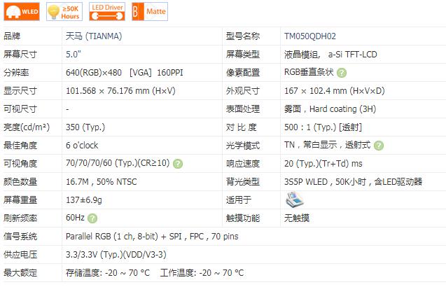 產(chǎn)品名稱:TM050QDH02車載液晶屏 安防可視顯示屏